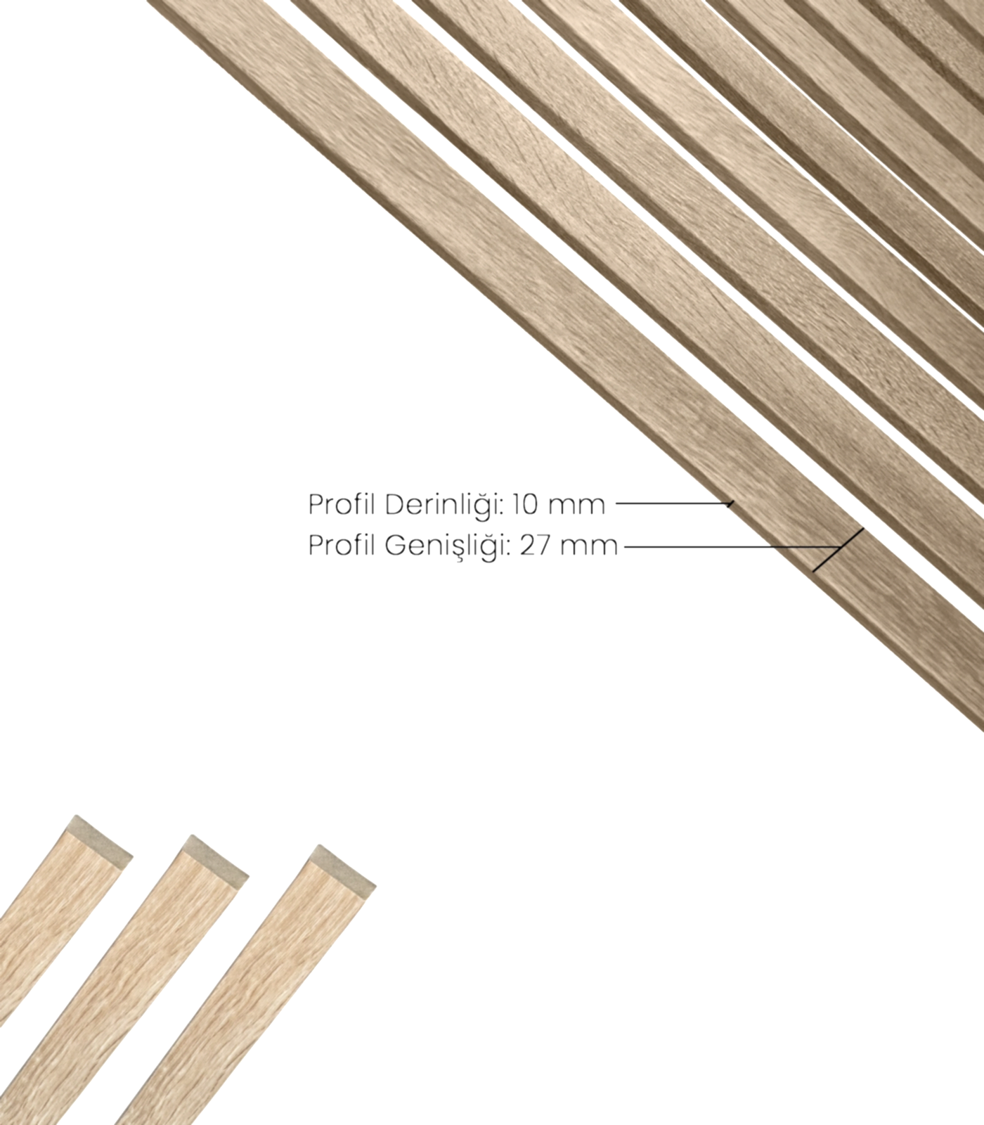 Ahşap profiller, bir inovasyon ürünüdür. Bir profilin ölçüleri 2,7×240 cm’dir. Paket içeriğinde 12 adet ahşap duvar profili bulunmaktadır. Ahşap duvar profillerinin arka yüzeyinde özel olarak üretilmiş yapışkanı bulunmaktadır. Ahşap profilin derinliği 10 mm’dir. Oldukça hafif olup, kendin yap deneyimi ile sadece 3 adımda duvara kolayca montajını yapabilirsiniz.