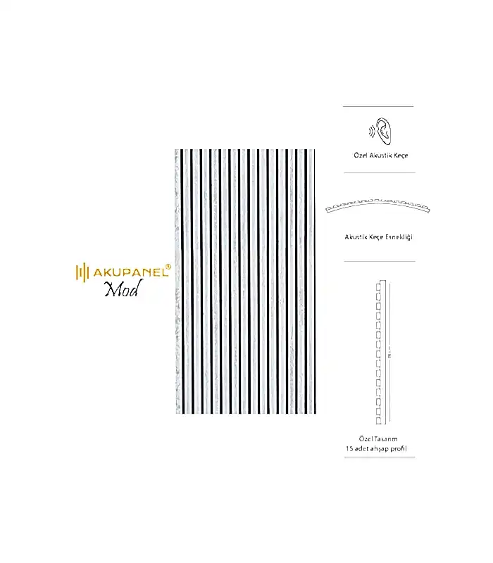 Akupanel, akustik ve dekorasyonu bir araya getiren inovasyon ürünüdür. Bir akupanel ölçülerimiz 60×120 cm dir. Bir akupanel ahşap duvar panelinde 8 adet ahşap profil bulunmaktadır. Ahşap duvar profilleri özel olarak üretilmiş sertifikalı akustik keçe üzerine montajı yapılmıştır. Akupanel’in derinliği 14 mm dir. Oldukça hafif ve eğimli duvarları saracak şekilde esnek bir yapıya sahiptir. Kendin yap deneyimi ile sadece 3 adımda duvara kolayca montajını yapabilirsiniz.