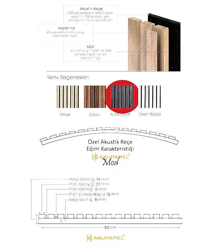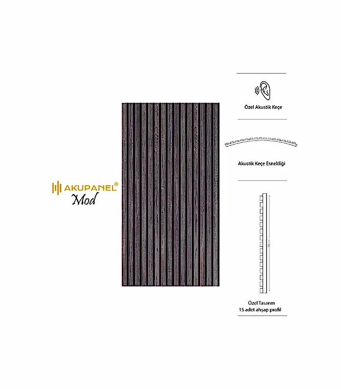 Akupanel, akustik ve dekorasyonu bir araya getiren inovasyon ürünüdür. Bir akupanel ölçülerimiz 60×120 cm dir. Bir akupanel ahşap duvar panelinde 8 adet ahşap profil bulunmaktadır. Ahşap duvar profilleri özel olarak üretilmiş sertifikalı akustik keçe üzerine montajı yapılmıştır. Akupanel’in derinliği 14 mm dir. Oldukça hafif ve eğimli duvarları saracak şekilde esnek bir yapıya sahiptir. Kendin yap deneyimi ile sadece 3 adımda duvara kolayca montajını yapabilirsiniz.