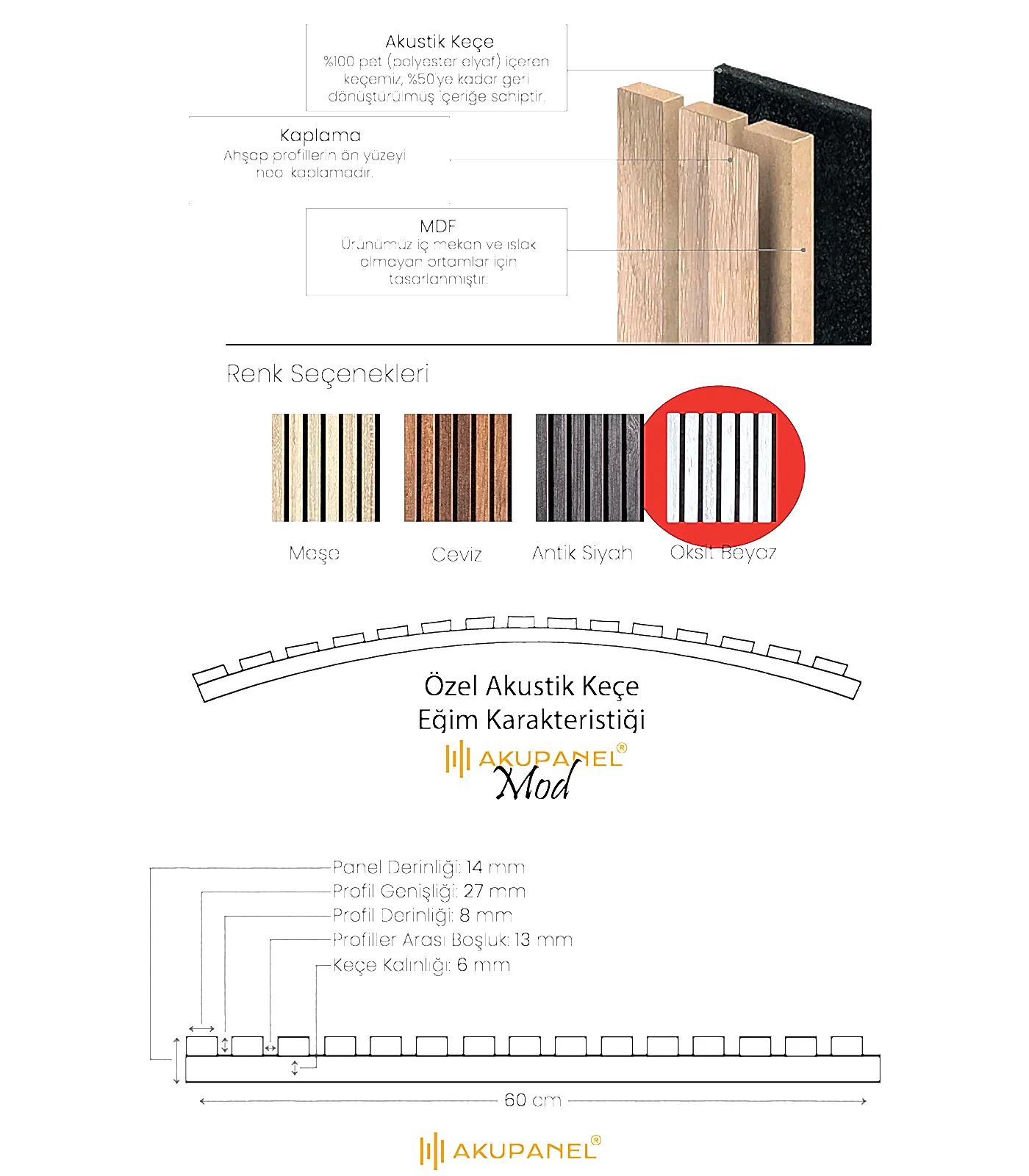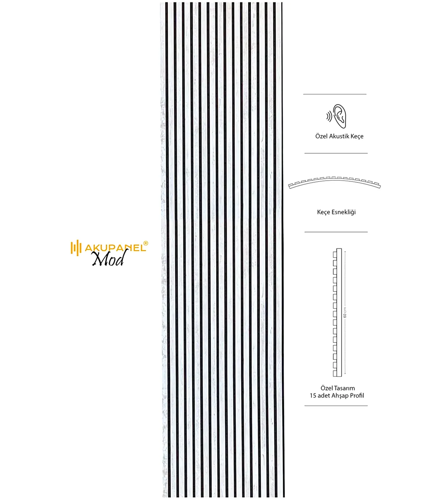 Akupanel, akustik ve dekorasyonu bir araya getiren inovasyon ürünüdür. Bir akupanel ölçülerimiz 60×245 cm dir. Bir akupanel ahşap duvar panelinde 15 adet ahşap profil bulunmaktadır. Ahşap duvar profilleri özel olarak üretilmiş sertifikalı akustik keçe üzerine montajı yapılmıştır. Akupanel’in derinliği 14 mm dir. Oldukça hafif ve eğimli duvarları saracak şekilde esnek bir yapıya sahiptir. Kendin yap deneyimi ile sadece 3 adımda duvara kolayca montajını yapabilirsiniz.
