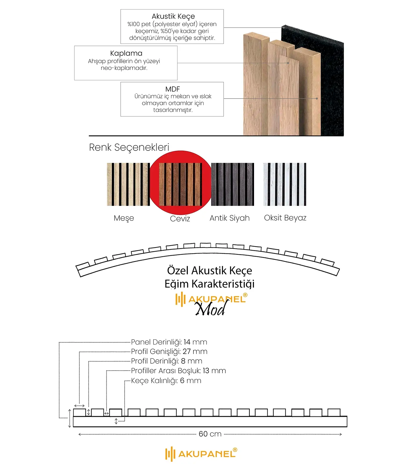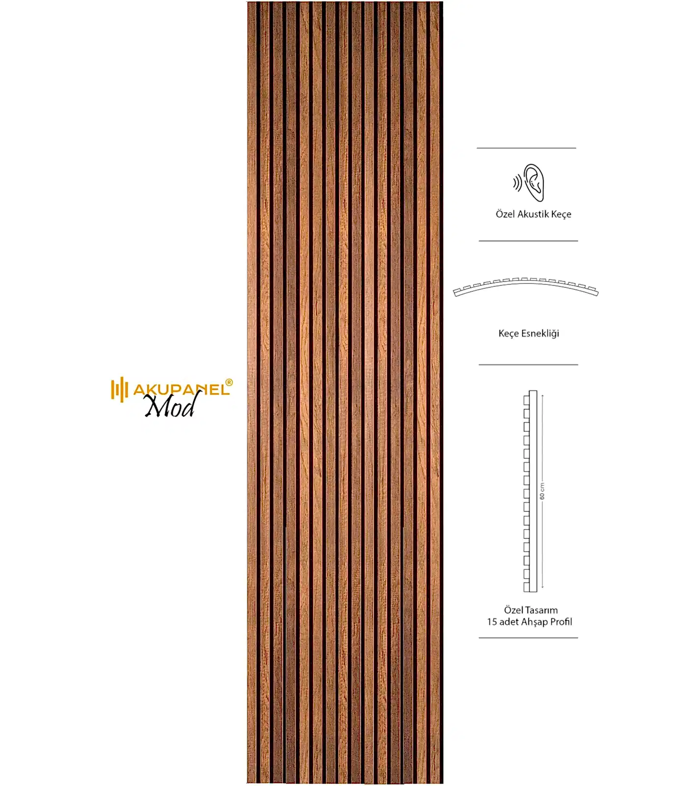 Akupanel, akustik ve dekorasyonu bir araya getiren inovasyon ürünüdür. Bir akupanel ölçülerimiz 60×245 cm dir. Bir akupanel ahşap duvar panelinde 15 adet ahşap profil bulunmaktadır. Ahşap duvar profilleri özel olarak üretilmiş sertifikalı akustik keçe üzerine montajı yapılmıştır. Akupanel’in derinliği 14 mm dir. Oldukça hafif ve eğimli duvarları saracak şekilde esnek bir yapıya sahiptir. Kendin yap deneyimi ile sadece 3 adımda duvara kolayca montajını yapabilirsiniz.