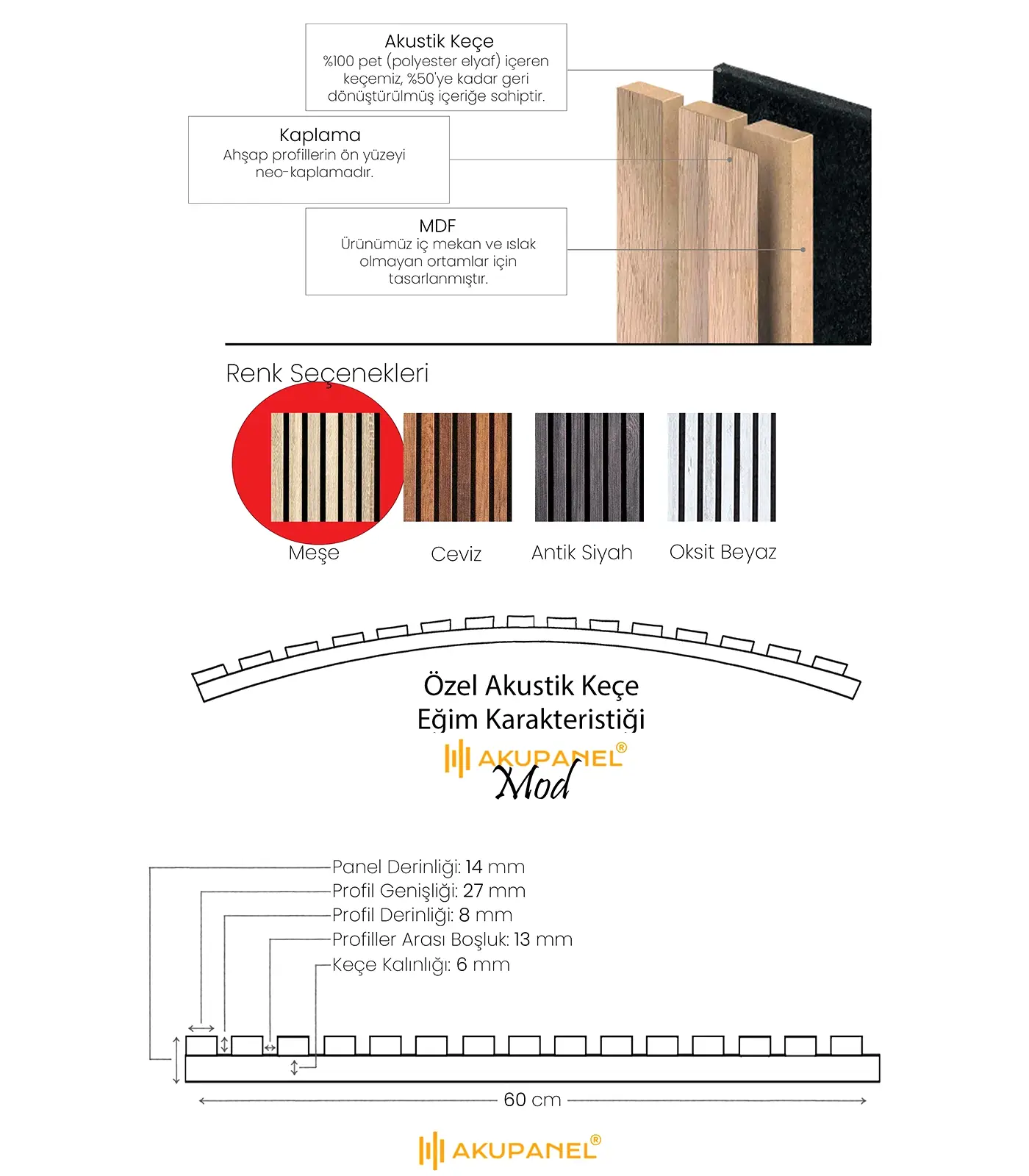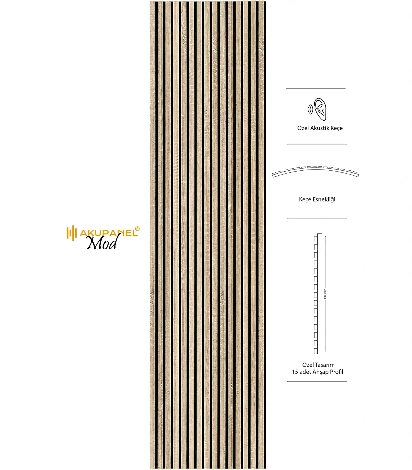 Akupanel, akustik ve dekorasyonu bir araya getiren inovasyon ürünüdür. Bir akupanel ölçülerimiz 60×245 cm dir. Bir akupanel ahşap duvar panelinde 15 adet ahşap profil bulunmaktadır. Ahşap duvar profilleri özel olarak üretilmiş sertifikalı akustik keçe üzerine montajı yapılmıştır. Akupanel’in derinliği 14 mm dir. Oldukça hafif ve eğimli duvarları saracak şekilde esnek bir yapıya sahiptir. Kendin yap deneyimi ile sadece 3 adımda duvara kolayca montajını yapabilirsiniz.