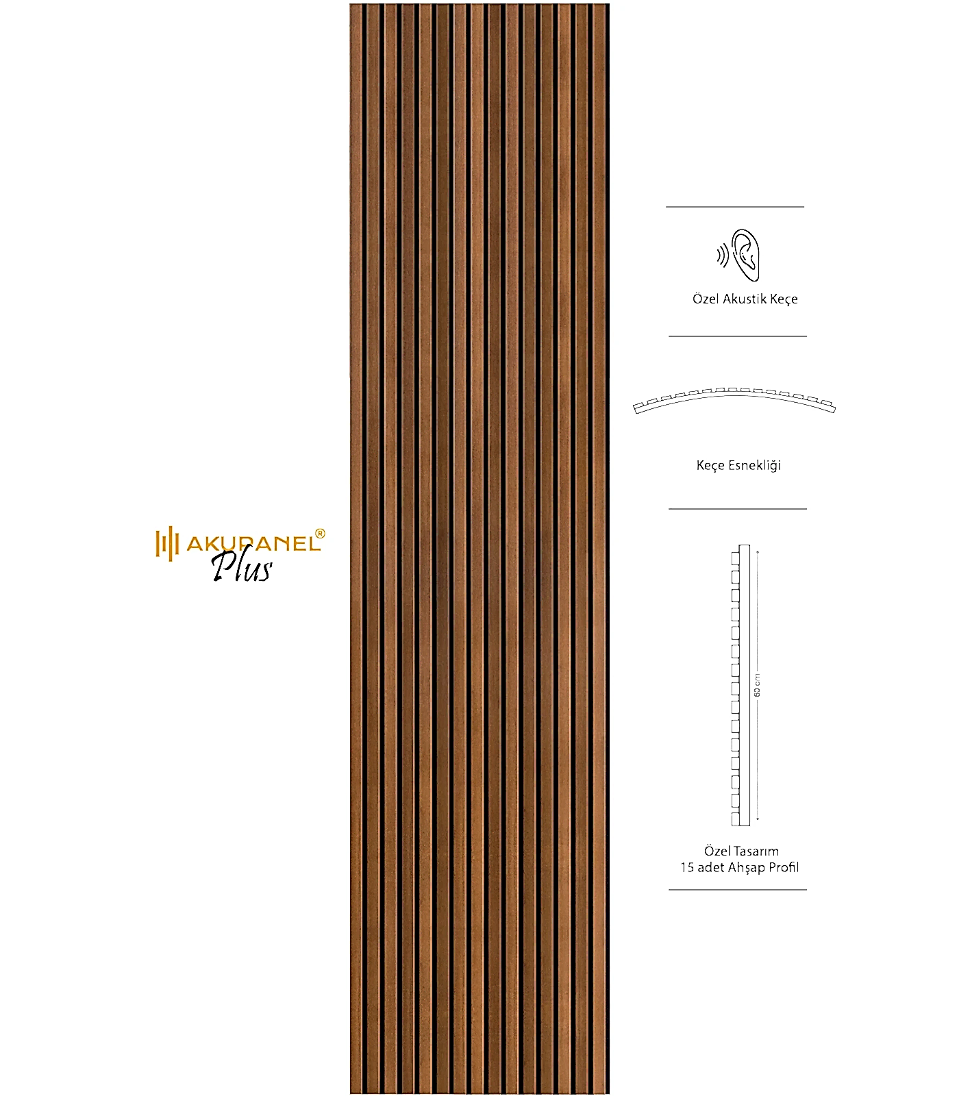 Akupanel, akustik ve dekorasyonu bir araya getiren inovasyon ürünüdür. Bir akupanel ölçülerimiz 60×245 cm dir. Bir akupanel ahşap duvar panelinde 15 adet ahşap profil bulunmaktadır. Ahşap duvar profilleri özel olarak üretilmiş sertifikalı akustik keçe üzerine montajı yapılmıştır. Akupanel’in derinliği 16 mm dir. Oldukça hafif ve eğimli duvarları saracak şekilde esnek bir yapıya sahiptir. Kendin yap deneyimi ile sadece 3 adımda duvara kolayca montajını yapabilirsiniz.