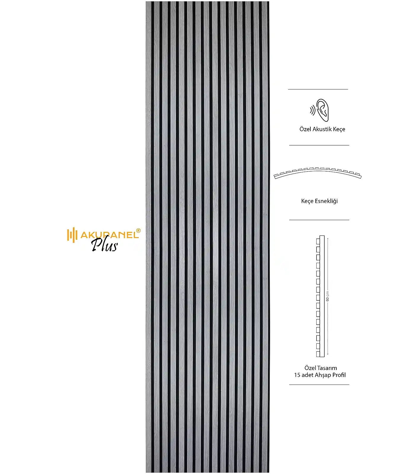 Akupanel, akustik ve dekorasyonu bir araya getiren inovasyon ürünüdür. Bir akupanel ölçülerimiz 60×245 cm dir. Bir akupanel ahşap duvar panelinde 15 adet ahşap profil bulunmaktadır. Ahşap duvar profilleri özel olarak üretilmiş sertifikalı akustik keçe üzerine montajı yapılmıştır. Akupanel’in derinliği 16 mm dir. Oldukça hafif ve eğimli duvarları saracak şekilde esnek bir yapıya sahiptir. Kendin yap deneyimi ile sadece 3 adımda duvara kolayca montajını yapabilirsiniz.