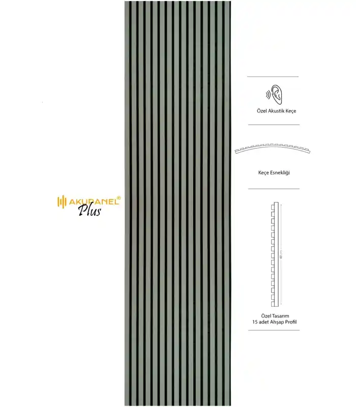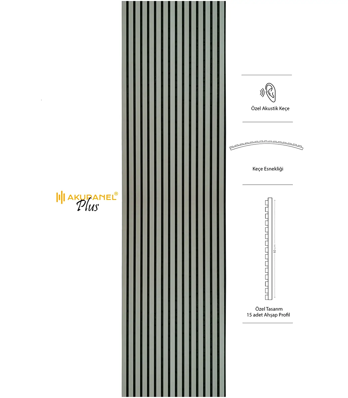 Akupanel, akustik ve dekorasyonu bir araya getiren inovasyon ürünüdür. Bir akupanel ölçülerimiz 60×245 cm dir. Bir akupanel ahşap duvar panelinde 15 adet ahşap profil bulunmaktadır. Ahşap duvar profilleri özel olarak üretilmiş sertifikalı akustik keçe üzerine montajı yapılmıştır. Akupanel’in derinliği 16 mm dir. Oldukça hafif ve eğimli duvarları saracak şekilde esnek bir yapıya sahiptir. Kendin yap deneyimi ile sadece 3 adımda duvara kolayca montajını yapabilirsiniz.