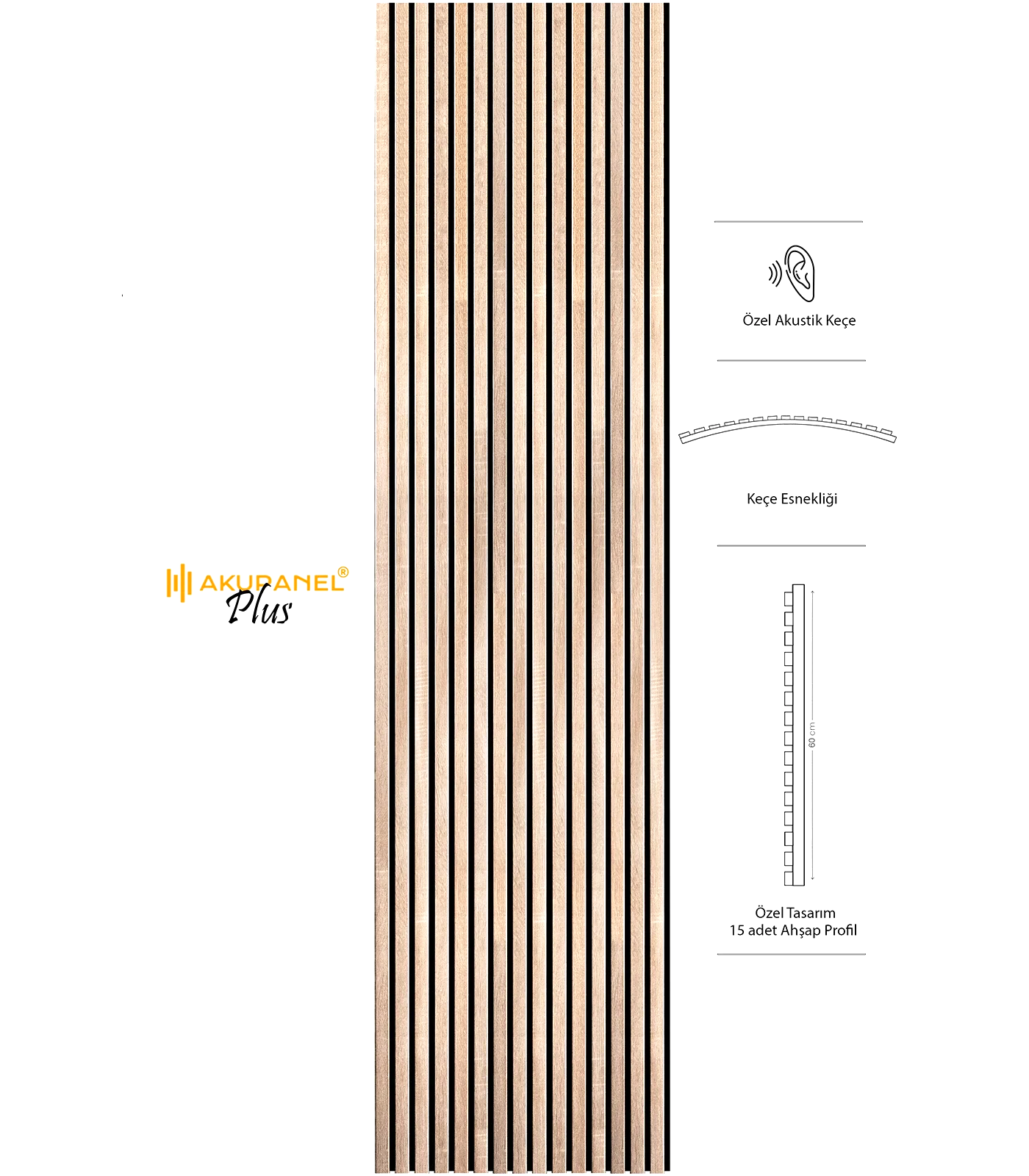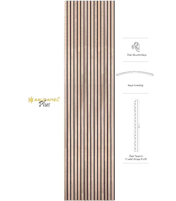 Akupanel, akustik ve dekorasyonu bir araya getiren inovasyon ürünüdür. Bir akupanel ölçülerimiz 60×245 cm dir. Bir akupanel ahşap duvar panelinde 15 adet ahşap profil bulunmaktadır. Ahşap duvar profilleri özel olarak üretilmiş sertifikalı akustik keçe üzerine montajı yapılmıştır. Akupanel’in derinliği 16 mm dir. Oldukça hafif ve eğimli duvarları saracak şekilde esnek bir yapıya sahiptir. Kendin yap deneyimi ile sadece 3 adımda duvara kolayca montajını yapabilirsiniz.