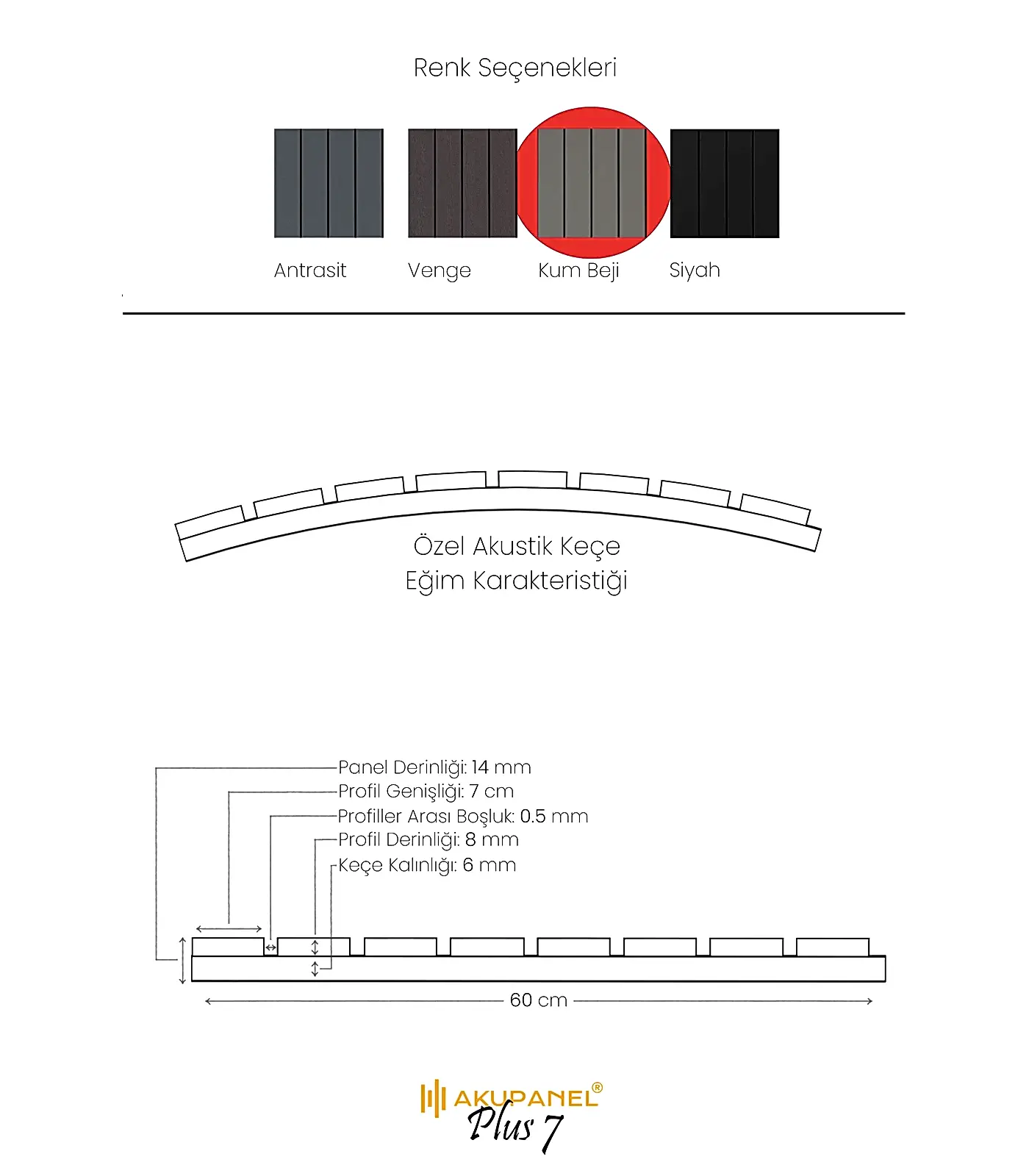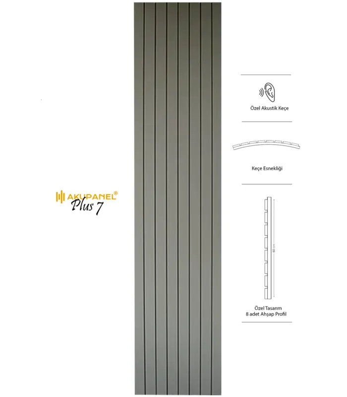 Akupanel, akustik ve dekorasyonu bir araya getiren inovasyon ürünüdür. Bir akupanel ölçülerimiz 60×245 cm dir. Bir akupanel ahşap duvar panelinde 8 adet ahşap profil bulunmaktadır. Ahşap duvar profilleri özel olarak üretilmiş sertifikalı akustik keçe üzerine montajı yapılmıştır. Akupanel’in derinliği 16 mm dir. Oldukça hafif ve eğimli duvarları saracak şekilde esnek bir yapıya sahiptir. Kendin yap deneyimi ile sadece 3 adımda duvara kolayca montajını yapabilirsiniz.